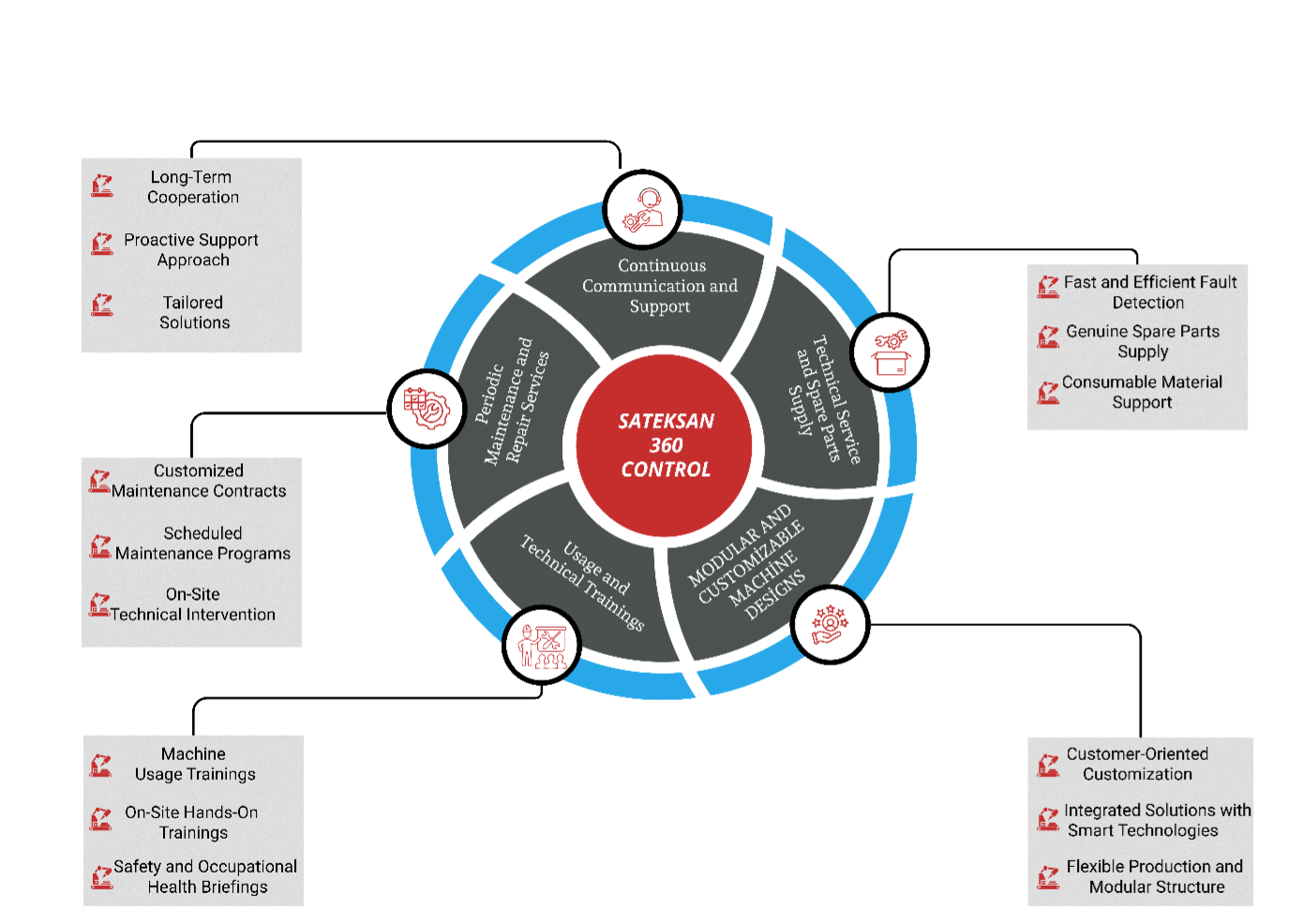 SATEKSAN 360 Kontrol Ekibi olarak en önemli hedefimiz, makinelerimizin yedek parça ve sarf malzeme ihtiyaçlarını en hızlı şekilde karşılayarak kesintisiz ve yüksek performanslı çalışmasını sağlamaktır.