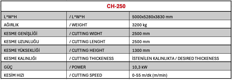 CH-250, poliüretan (PU), visko sünger (memory foam) ve farklı yoğunluktaki esnek süngerlerin hassas ve hızlı bir şekilde kesilmesi için geliştirilmiş, tam otomatik bir CNC makinesidir. 90° dönebilen tablası ve ±360° dönebilen bıçak yapısı sayesinde, CAD çizimlerinden aldığı verilerle karmaşık 2D ve 3D şekilleri, eğimleri ve özel şekilleri kusursuz şekilde keser. Bu sayede üretim süreci hızlanır, malzeme israfı minimuma iner ve yüksek kalite standardı yakalanır.