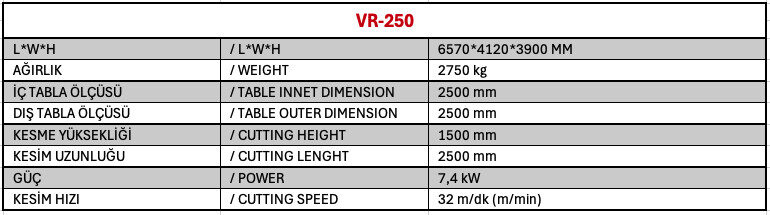 Makine; sünger bloklarının düzeltilmesi, istenilen ölçülere getirilmesi, kesim listesine göre dilimlenmesi ve dikdörtgen (takoz) kesimlerin yapılması için idealdir. Bloklar sabit bir masa üzerine yerleştirilir ve iki sürücü tarafından milimetrik hassasiyetle pozisyonlandırılır. Hareketli kesim gövdesi sayesinde tüm işlemler yüksek hız ve üstün kaliteyle tamamlanır. VR-250, sünger kesim sürecini kolaylaştırırken üretimde yüksek verimlilik ve tutarlılık sağlar.