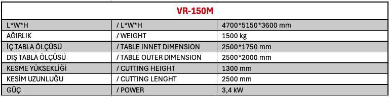 1300 mm kesim yüksekliği ve 404 mm çapında bıçak tekerlekleriyle PU, lateks ve özel süngerleri hassas şekilde keser. 2500×2000 mm boyutlarındaki paslanmaz çelik tablası, 1000 kg’a kadar yük taşıma kapasitesiyle küçük üretim gruplarına uygundur. Siemens ve Lenze marka bileşenleriyle donatılan VR-150M, güvenilirlik ve uzun ömürlü performans garanti eder.